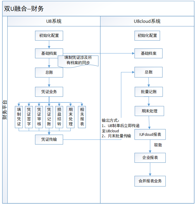 U8系統(tǒng)處理總賬相關(guān)業(yè)務(wù),憑證實(shí)時(shí)或月末傳遞至U8cloud系統(tǒng)。iUFOcloud企業(yè)報(bào)表根據(jù)U8系統(tǒng)傳遞的憑證進(jìn)行取數(shù),生成各自分子公司的四大主表(資產(chǎn)負(fù)債表、利潤表、現(xiàn)金流量表、所有者權(quán)益變動表);未企業(yè)出具合并報(bào)表提供數(shù)據(jù)。