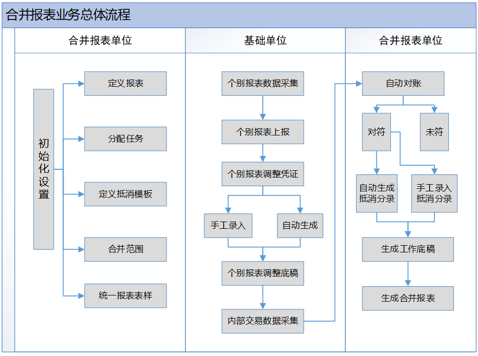 上圖描述的是一次合并的完整應(yīng)用流程,是采用大合并的方式進(jìn)行合并的操作步驟示意。如果整個(gè)集團(tuán)采用逐級合并的方式進(jìn)行合并,則每級合并主體都要經(jīng)歷上述合并過程,且上級的合并要在下級的合并完成后進(jìn)行。用逐級合并的方式完成一次集團(tuán)合并,相當(dāng)于多個(gè)合并流程的疊加。