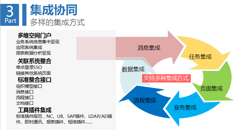 第三環(huán)是集成協(xié)同。任何企業(yè)都在多個(gè)系統(tǒng)中間,要思考多個(gè)系統(tǒng)之間怎么把數(shù)據(jù)共享起來(lái)?怎么把信息整合起來(lái)?怎么產(chǎn)生通用的信息門(mén)戶(hù),能達(dá)到更高效的信息推送和自動(dòng)推薦?